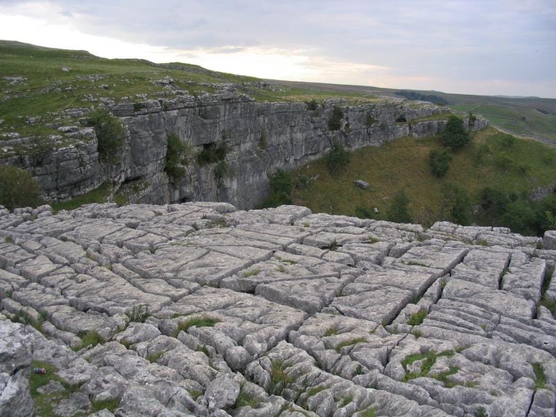 Last weekend, I visited Malham Cove in the Yorkshire Dales. This hulk of limestone rock weathered away over 10,000 years ago during the last Ice Age to carve out a 260-foot cliff. Once you have climbed up its back, you reach a long limestone pavement where you must step and jump across shallow crevasses to reach the moor beyond.